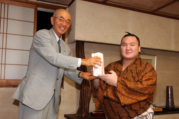 市長が横綱 白鵬関に稲荷の御守りを渡している写真 拡大画像 (JPEG: 283.2KB)