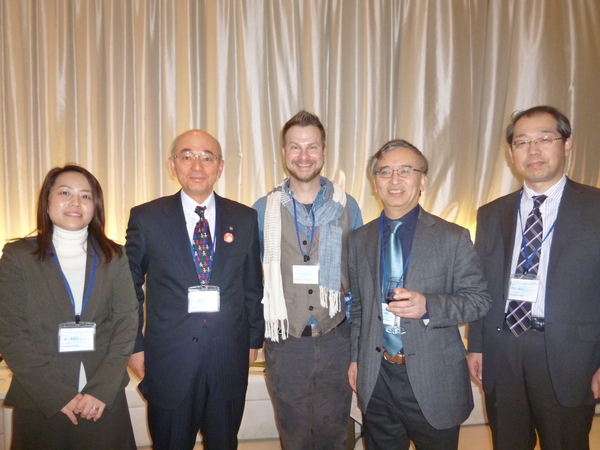 プロジェクトスクリーンの前の用意された席に座る外国人男女3名とスーツを着た男性2名の写真 拡大画像 (JPEG: 44.9KB)