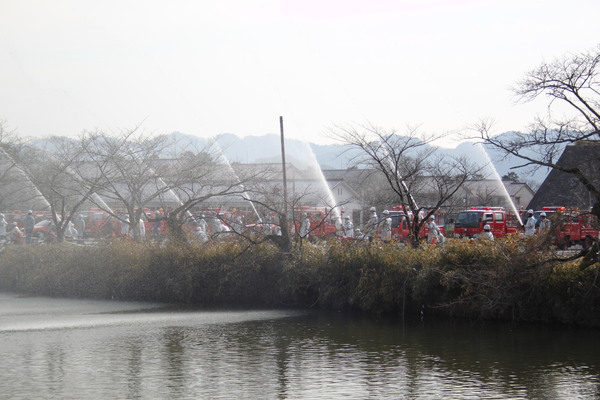 消防団員らが池に向かって放水演習を行っている写真 拡大画像 (JPEG: 65.4KB)