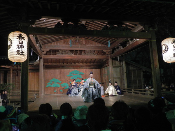 春日神社の境内で3名のこづつみと1名の笛の演奏をバックに男性が三番叟の薄い青色の衣装を着て両手を広げ元朝能の舞を披露している写真 拡大画像 (JPEG: 73.2KB)