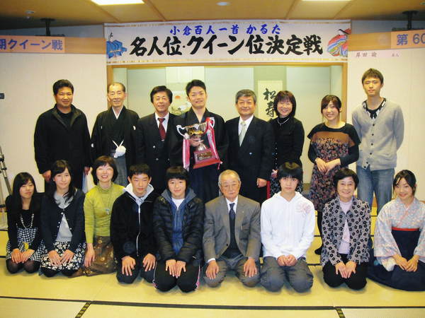 かるた大会で初防衛の岸田 諭名人がトロフィーを持って篠山かるた協会の皆さんと一緒に記念撮影している写真 拡大画像 (JPEG: 50.7KB)