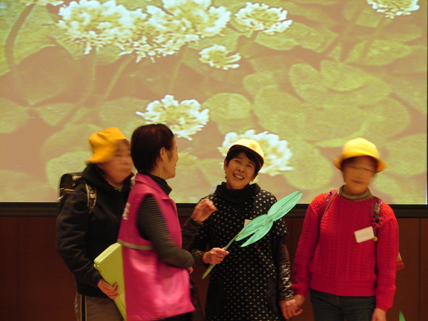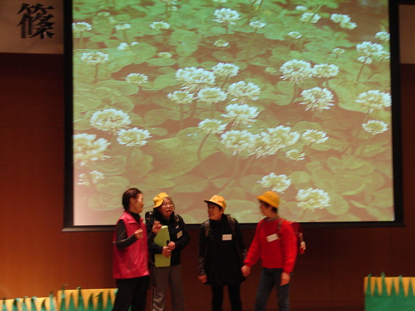 スクリーンには花の絵が写り、舞台では女性達ががランドセルに黄色い帽子を被り劇をしている写真 拡大画像 (JPEG: 137.1KB)