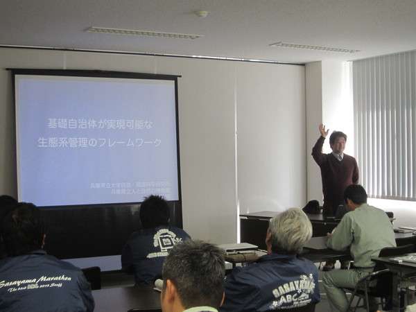 三橋先生からは、豊岡市のコウノトリをテーマとした取り組みなどを示され、「グランドデザインが必要、総合計画に位置づけ、環境の部署だけでなく、市・市民あげての取り組みが大切です。」とされました。