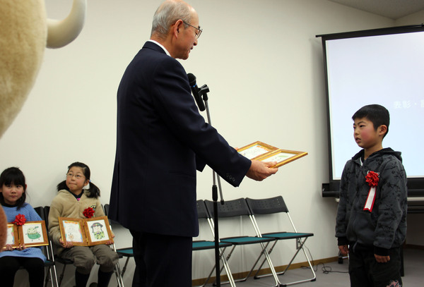 昨年秋に市内の小学生を対象に募集してきました「まるいの」くんのお友だち(ガールフレンド)キャラクターの入賞作が決定し、1月25日土曜日に表彰式を行いました。