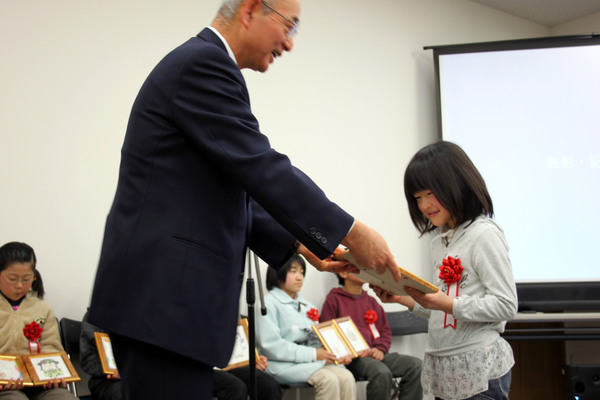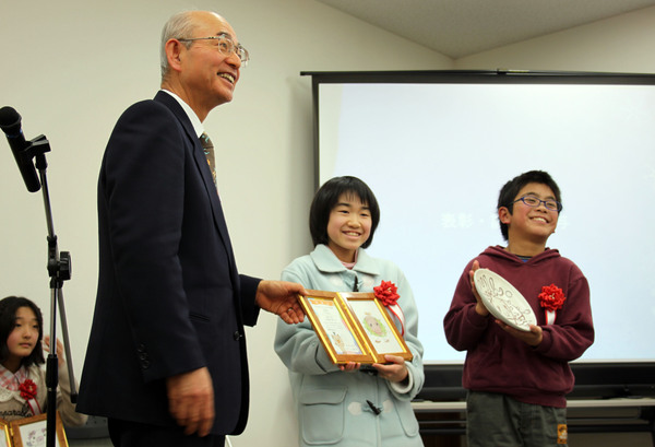 くりんが描かれたお皿を持っている男の子と額に入った賞状を持っている女の子が市長とならんで写した写真 拡大画像 (JPEG: 60.9KB)