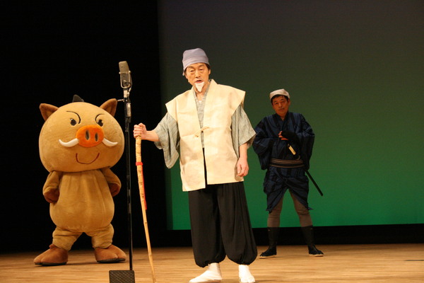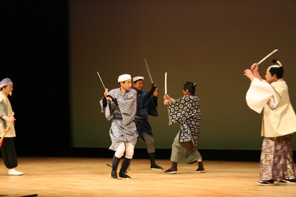 殿様の衣装を着た男性と、商人の衣装を着た男性、悪役の侍の衣装を着た男性が舞台上で寸劇をしている様子の写真 拡大画像 (JPEG: 71.9KB)