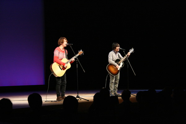 兄弟アコースティックデュオの「ちめいど」の二人がスタンドマイクを使ってギターを弾きながら歌を歌っている写真 拡大画像 (JPEG: 31.4KB)