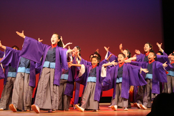 楽空間のメンバーが舞台上で紫色の羽織に茶色の袴を着て、両手を広げて歌いながら踊っている写真 拡大画像 (JPEG: 76.6KB)