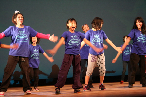 市民ミュージカルのメンバーがお揃いの紫色のティーシャツを着て、舞台上で両手を下に広げて笑顔で歌って踊っている写真 拡大画像 (JPEG: 70.9KB)