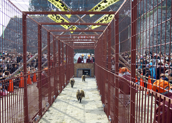 柵で囲まれた細長いコースを小さな猪3匹が走っている写真 拡大画像 (JPEG: 165.0KB)