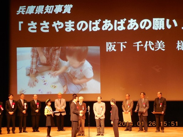 舞台上のスクリーンに兵庫県知事賞「ささやまのばあばあの願い」と写しだされ、その前で 阪下 千代美様が受賞されている写真 拡大画像 (JPEG: 70.3KB)
