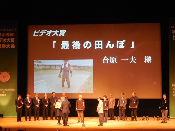 スクリーンにはーンにはビデオ大賞「最後の田んぼ」合原 一夫様とあり、賞を取られた方が並んでいる写真 拡大画像 (JPEG: 60.7KB)