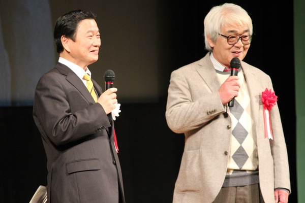 丹波篠山ビデオ大賞実行委員長 奥野 勇 さん、審査委員長 西垣 吉春 さんがマイクで話をしている写真 拡大画像 (JPEG: 91.2KB)