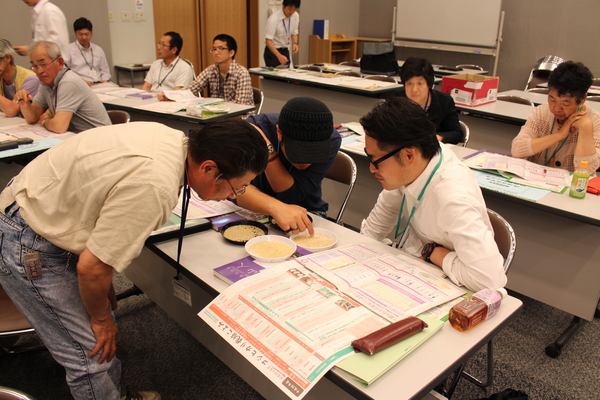 白い平たい皿にに入っている米を直接触って凝視している男性参加者3名の写真 拡大画像 (JPEG: 180.6KB)