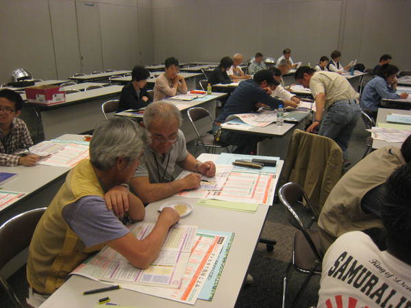 薄緑色の作業着を着ている女性が前に立って説明している講義を熱心に聞いている参加者の後ろ姿の写真 拡大画像 (JPEG: 69.1KB)