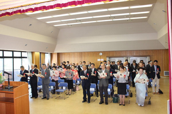 胸にリボンを付けた受賞者全員が席を立ち冊子を読み上げている写真 拡大画像 (JPEG: 81.5KB)