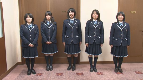 紺色の制服を着た篠山鳳鳴高校放送部女子生徒5名の集合写真 拡大画像 (JPEG: 34.5KB)