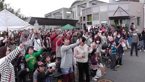 会場にはたくさんの親子が椅子に座り、前の席では戦隊ヒーローがお客さんとふれあっている写真 拡大画像 (JPEG: 64.5KB)