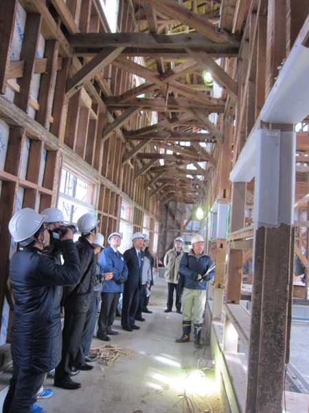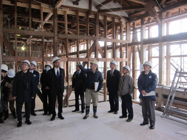 木組みの建物の中で薄い黄色のヘルッメトを被った男性が、関係者の前で、指をさして話をしている写真 拡大画像 (JPEG: 88.1KB)