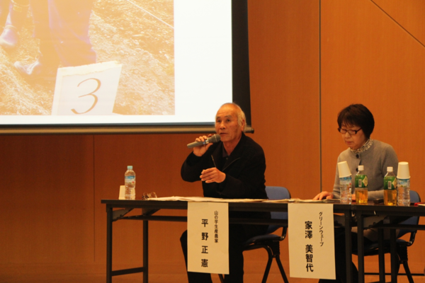 スクリーンに映像が映っており、その横で椅子に座りながらマイクを持った平野 正憲さんが発表している横で資料を見ている家澤 美智代さんの写真 拡大画像 (PNG: 329.4KB)
