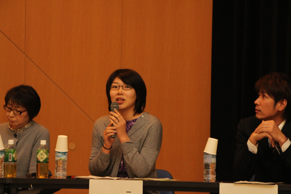 マイクを持った大内 正博さんが椅子に座りながら発表し、その横で片平 深雪さんが腕を組み、資料に目を通している写真 拡大画像 (PNG: 299.0KB)