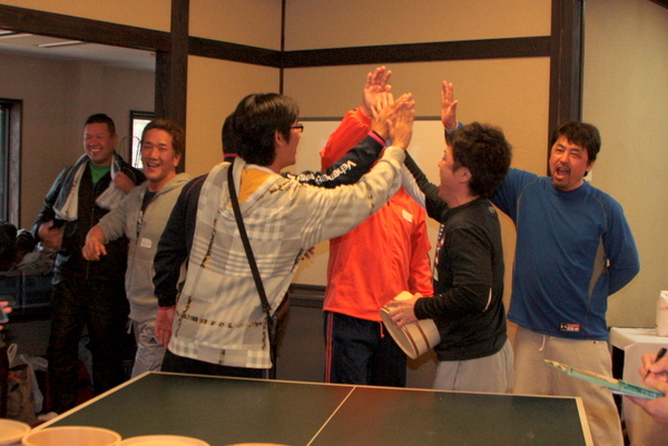 卓球台の端でハイタッチをしている男性の写真 拡大画像 (JPEG: 171.8KB)