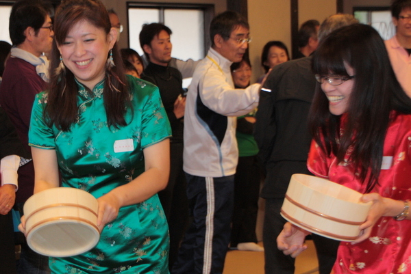 緑と赤のチャイナドレスを着た女性2人が桶を持って笑っている写真 拡大画像 (JPEG: 151.6KB)