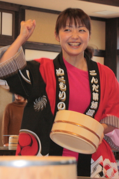 アニメのヤッターマン(ガンちゃん、アイちゃん)の格好をした女性が桶を持って構えている写真 拡大画像 (JPEG: 149.6KB)