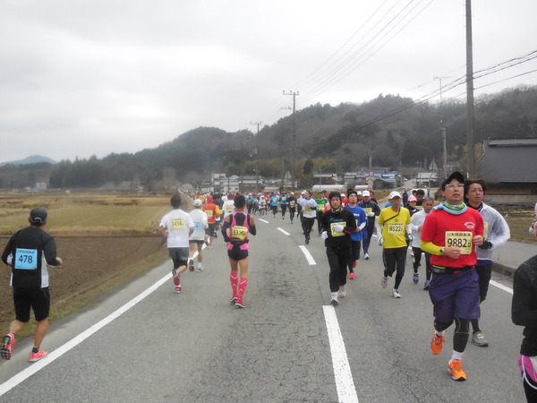 横には畑の広がった、すこし登りになっている道路を参加者たちが懸命に走っている写真 拡大画像 (JPEG: 77.5KB)