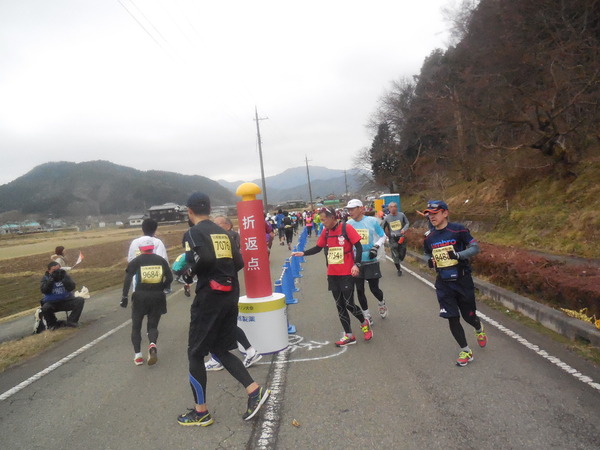 中央には折返点と書かれた赤いポールが立っていて、その周りを回りながら走って折り返すランナー達の写真 拡大画像 (JPEG: 77.6KB)