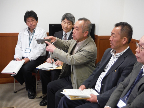 男性5名が椅子に座り、そのうちの一人が陶器を手に持ち説明をしている様子の写真 拡大画像 (PNG: 379.5KB)