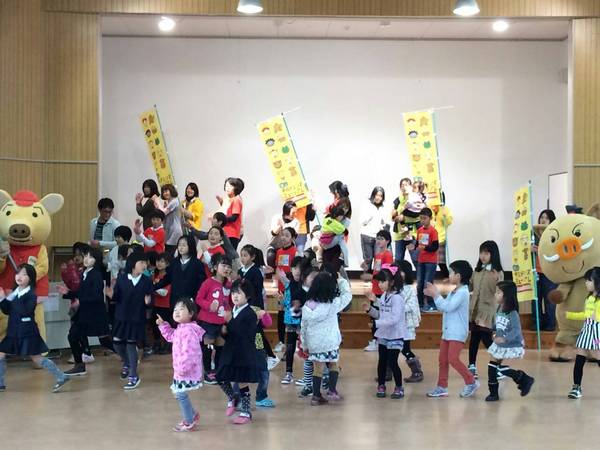 舞台では赤ちゃんを抱っこした女性たちが立ち、下では子供達がマスコット人形と踊っている写真 拡大画像 (JPEG: 159.7KB)