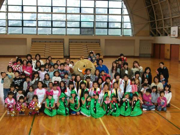 篠山市立川代体育館の中で色々な衣装を着ている子供達や大人が揃ってマスコット人形と一緒に記念写真 拡大画像 (JPEG: 53.0KB)