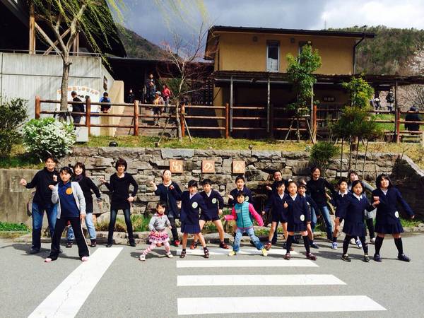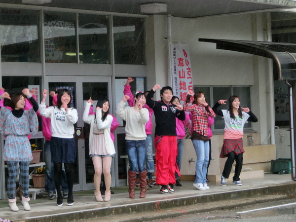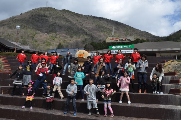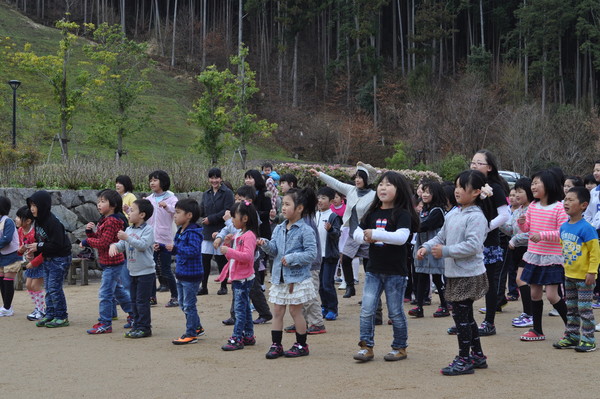 丹波伝統工芸公園立杭陶の郷の駐車場らしき場所で制服姿の子供達と小さな子供や大人も一緒に踊っている写真 拡大画像 (JPEG: 63.5KB)