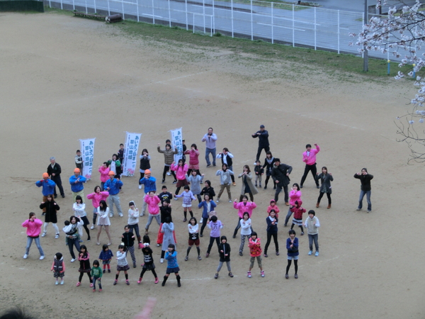 篠山市立西紀北小学校の子供達が運動場で大人と踊っている姿を上から撮影している写真 拡大画像 (JPEG: 217.4KB)