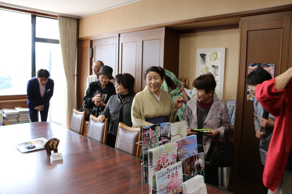 桜を市長室で女性の方々が見に来られている写真 拡大画像 (JPEG: 140.7KB)
