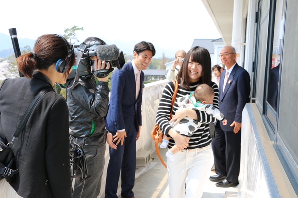 子供を抱っこしているお母さんを放送局の方が微笑ましく見ている写真 拡大画像 (JPEG: 144.4KB)