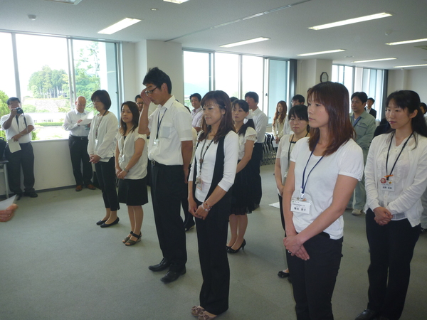 横1列に男性職員と女性職員が立っていて、窓際では男性が写真を撮っている写真 拡大画像 (JPEG: 183.3KB)