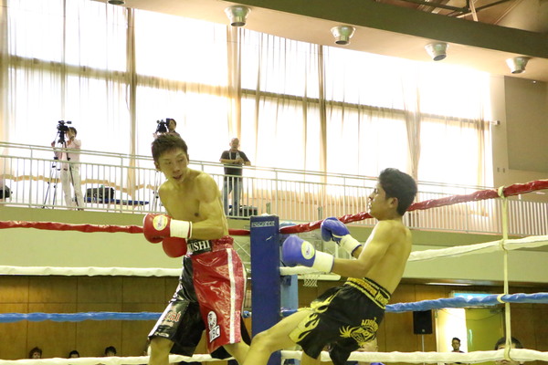 角谷 淳志選手が相手選手の右胸に左パンチをしてる写真 拡大画像 (JPEG: 79.6KB)