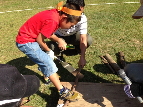 子供が一生懸命のこぎりで小さい丸太切って動かないように大人が支えている写真 拡大画像 (JPEG: 163.8KB)
