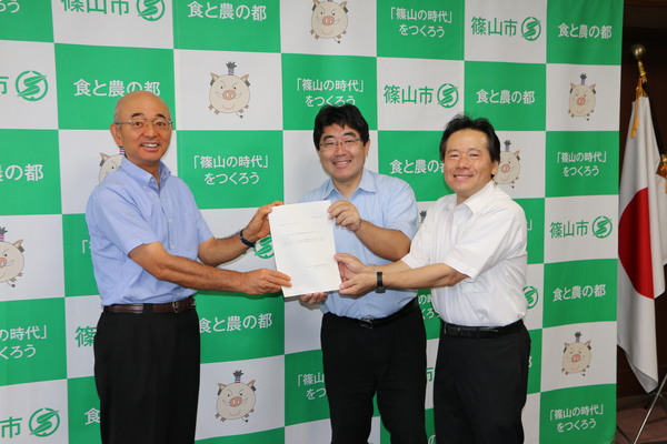 本年5月28日から4回にわたり検討委員会で議論していただいた(仮称)篠山市手話言語条例(案)について、9月9日、嘉田 眞典会長(公益社団法人兵庫県聴覚障害者協会)、大内 和彦委員(丹波ろうあ協会会長)から報告を受けました。