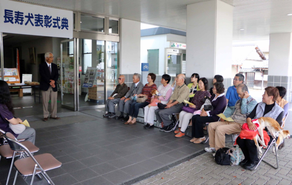 長寿犬表彰式に犬や参加された飼い主が座られていて、獣医師会長が話をしている写真 拡大画像 (PNG: 362.6KB)