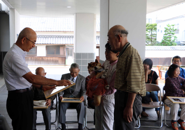 市内で登録のある飼い犬のうち、今年度内で17歳に達する犬を対象に長寿犬表彰式を行いました。兵庫県獣医師会の主催で、今年からは篠山の犬は篠山市で表彰を行うこととなりました。