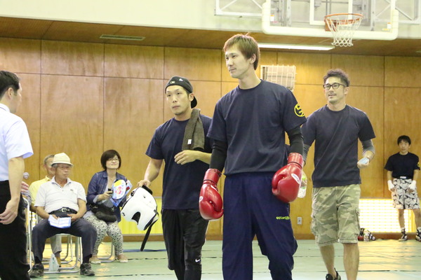 審判が前に立ち、ヘッドギアを付けて、波多野慎也さんが試合をしている写真 拡大画像 (JPEG: 71.4KB)
