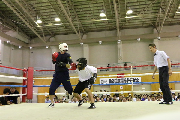 審判が右側にいて、相手が宮田祐樹さんのボディーにパンチするのを、宮田祐樹さんが左パンチしている写真 拡大画像 (JPEG: 82.8KB)