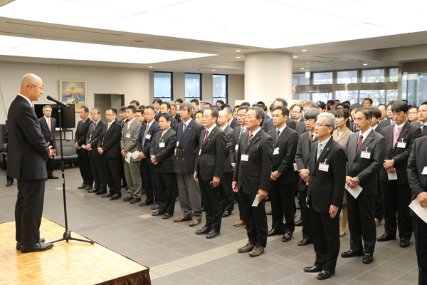 壇上のマイクに向かって林議長が話しをしているのを整列した職員が聞いている前方の写真 拡大画像 (JPEG: 122.4KB)
