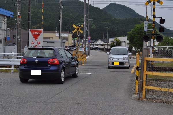 道幅の狭い弁天踏切に手前には青い乗用車、対向車線にはグレーの軽自動車が踏切の停止線で停止している様子の写真 拡大画像 (JPEG: 97.4KB)