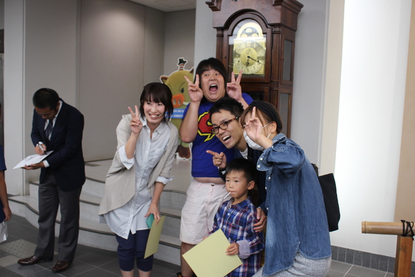 丹波篠山味まつりスポーツフェスタに来た女性二人と男の子のお客さんと一緒に記念写真を撮っているガリガリガリクソンさんと女と男の市川さんを写している写真 拡大画像 (JPEG: 123.8KB)