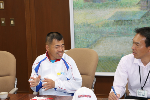 ジャージ姿の、岡 淳司(おか じゅんじ)さんと関係者が会話をしている写真 拡大画像 (JPEG: 135.5KB)