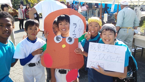 手作りの被り物ライスバーガーから顔を出している男の子と、ライスバーガーの値段が書かれた画用紙を持っている男の子らが一緒に記念撮影している写真 拡大画像 (JPEG: 143.7KB)